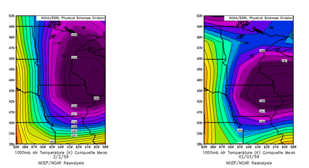 Temperatures climbed across Iowa between February 2nd (left) and the 3rd (right) as southerly winds ahead of an advancing cold front pumped in milder air; however, it was still well below freezing and plenty cold enough for snow to form in the increasingly humid air mass; map courtesy NOAA/NCAR reanalysis