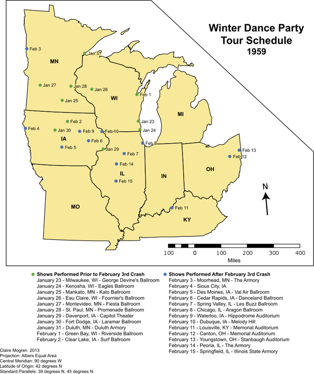 An ambitious tour referred to as the “Winter Dance Party” included 24 stops in 24 days across the Upper Midwest during January and February of 1959.