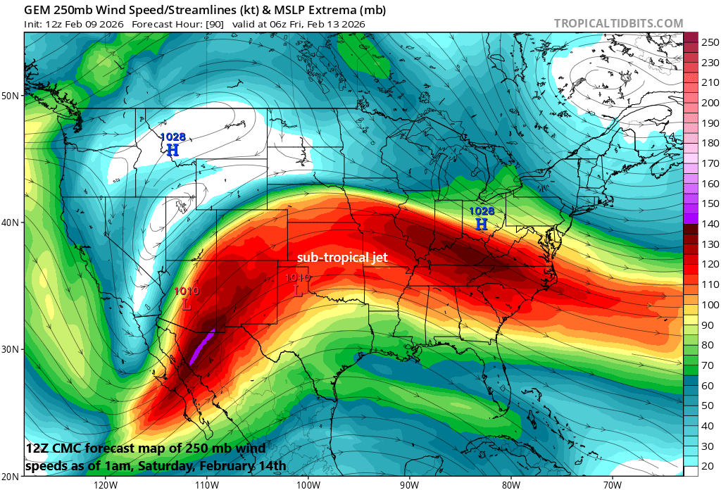 The polar jet has dominated the scene across North America in recent weeks, but the sub-tropical jet is coming to life as La Nina fades across the equatorial part of the Pacific. In fact, a storm system will ride along the sub-tropical jet stream during this week first impacting California at mid-week and then likely the Mid-Atlantic region by the latter part of the upcoming weekend. Map courtesy Canadian Met Centre, tropicaltidbits.com