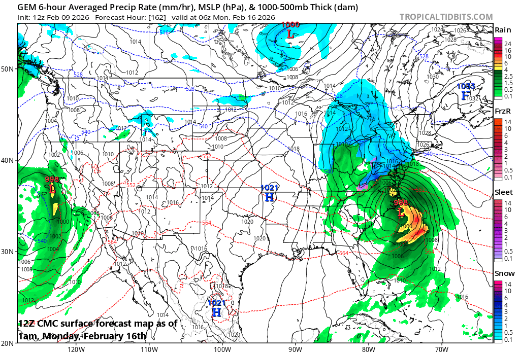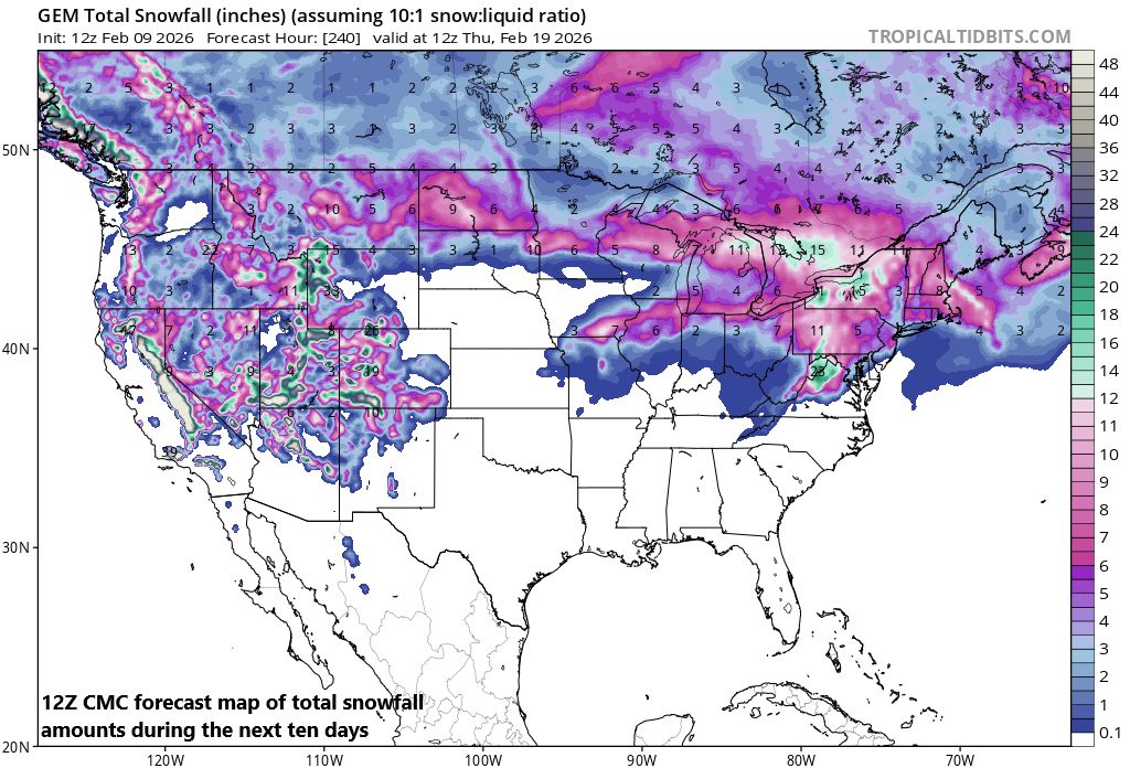The western states have largely missed out on snowfall in recent weeks, but a change in the overall pattern will bring significant snow during the next ten days from the Sierra Nevada Mountains of eastern California to the Colorado Rockies. Meanwhile, back to the east, there can be some accumulating snow during the latter half of the upcoming weekend; especially, in the higher elevation locations to the north and west of Route I-95. Map courtesy Canadian Met Centre, tropicaltidbits.com