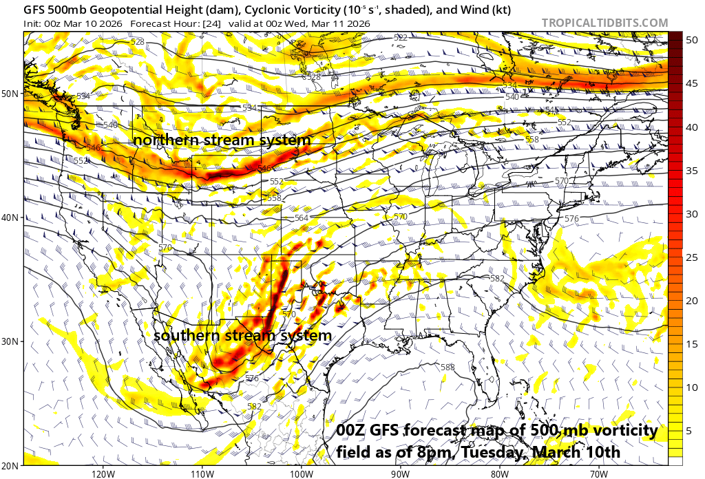A strong low-level jet will play a crucial role in the severe weather threat both later today and later tomorrow. This strong jet streak will add to the overall shear in the atmosphere raising the chance of tornadic activity including in the overnight hours. Maps courtesy NOAA, tropicaltidbits.com