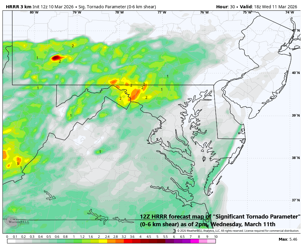 The severe weather threat during the next couple of days will include a risk of tornadoes and that’ll pertain to the Mid-Atlantic region later tomorrow/tomorrow night where low-level wind shear will become quite high. Map courtesy NOAA, Weather Bell, Tony Pann (X)