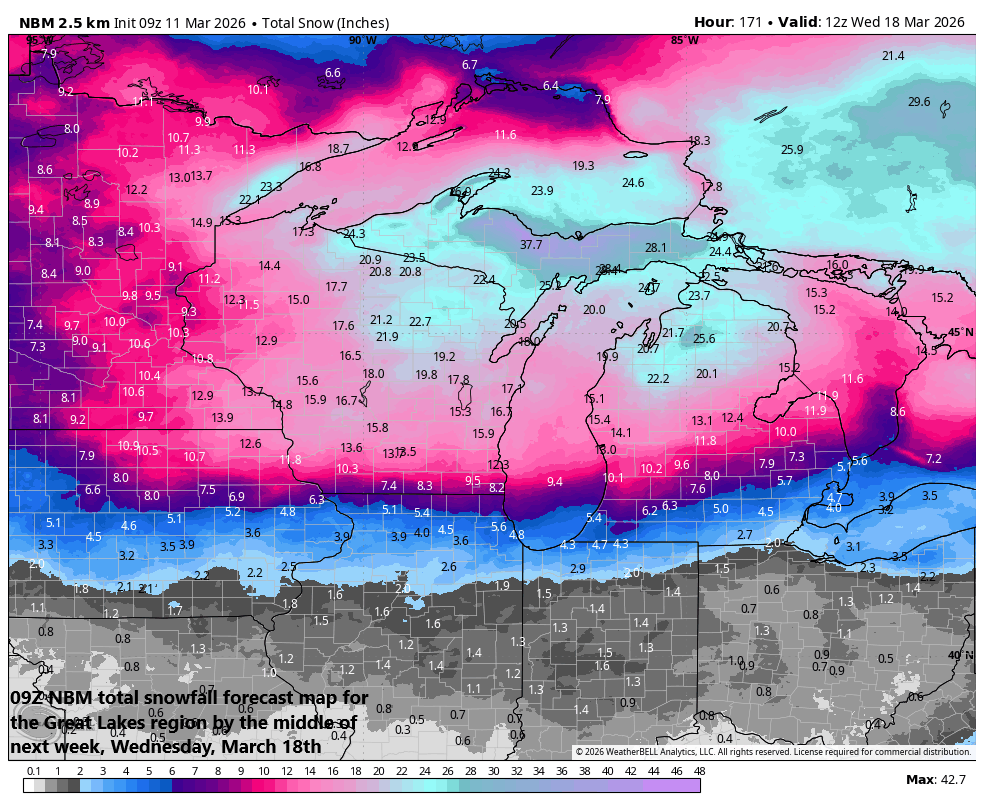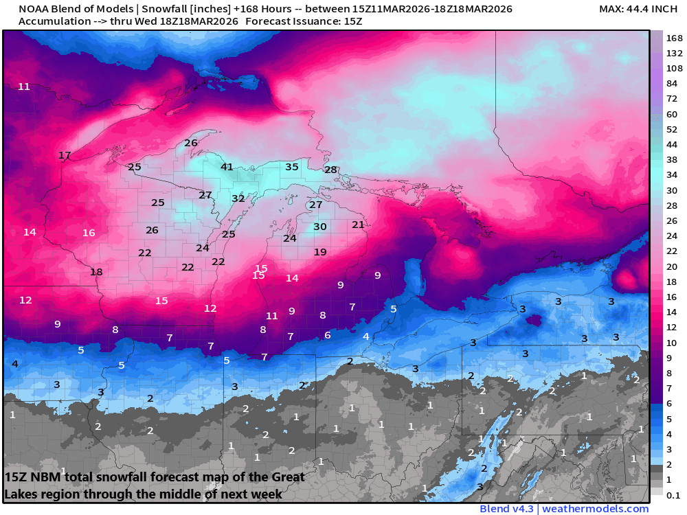 Much of this same Great Lake’s region may actually experience accumulating snow and strong winds on Friday as an appetizer to the main event which comes from late Sunday into Monday. A clipper system will move through the area on Friday and likely produce accumulating snow some two days ahead of the potential late weekend blizzard. The combination of these two storms may end up resulting in 1-2 feet of snow across portions of the Great Lakes by the time we get to the early part of next week...welcome to March Madness.