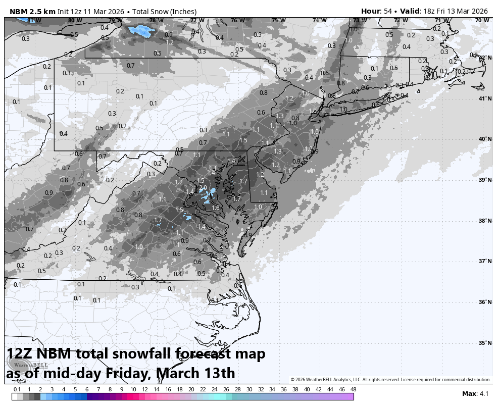 In an example of true March Madness, the Mid-Atlantic region can switch from record-breaking warmth in the 80’s to accumulating snow on Thursday following the passage of a strong cold front. Map courtesy NOAA, Weather Bell