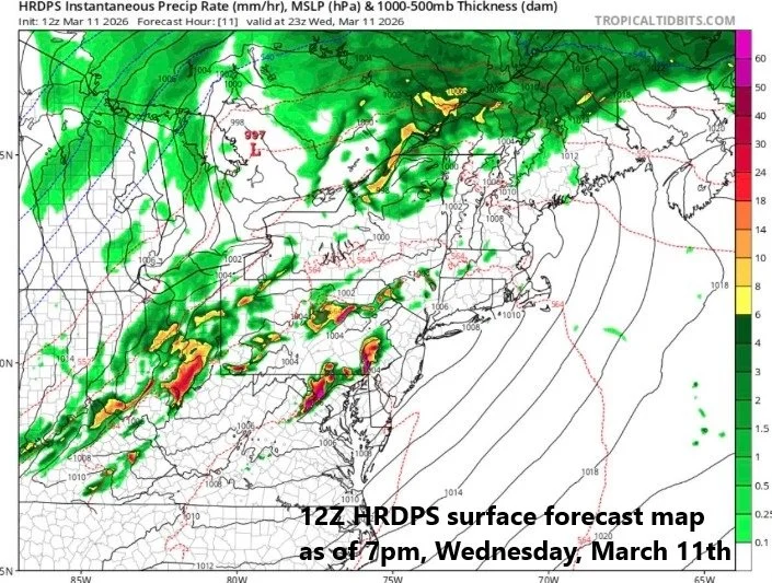 There is the threat of severe weather in much of the DC-to-Philly-to-NYC corridor later today/early tonight with tornadoes on the table. The most likely time period for the severe weather in the I-95 corridor is 5 to 9pm on Wednesday, March 11th. Map courtesy NOAA, weathermodels.com