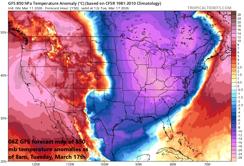 Over the weekend, another strong cold front will enter the picture across the nation’s midsection with a widespread colder-than-normal air mass on its backside and charging to the south and east. A strong storm system is likely to form along the frontal boundary zone as upper-level support arrives, and the Great Lakes may end up with an all-out blizzard come late Sunday into Monday with plenty of snow and powerful winds. In fact, there can be accumulating snow and strong winds in this same Great Lakes region on Friday from a clipper-system and this would just be an appetizer for the potential late weekend blizzard. The widespread colder-than-normal air mass reaches the eastern states by late Monday and the 20’s and 30’s will be commonplace in the Mid-Atlantic region by the time we get to next Tuesday for afternoon highs...a far cry from the past couple of days. Looking ahead, as is often the case during the month of March, the early-to-mid week cold snap in the eastern states may change dramatically to much milder conditions by the end of next week and yes, this wild weather pattern can flip again with yet another widespread cold air outbreak later in the month.