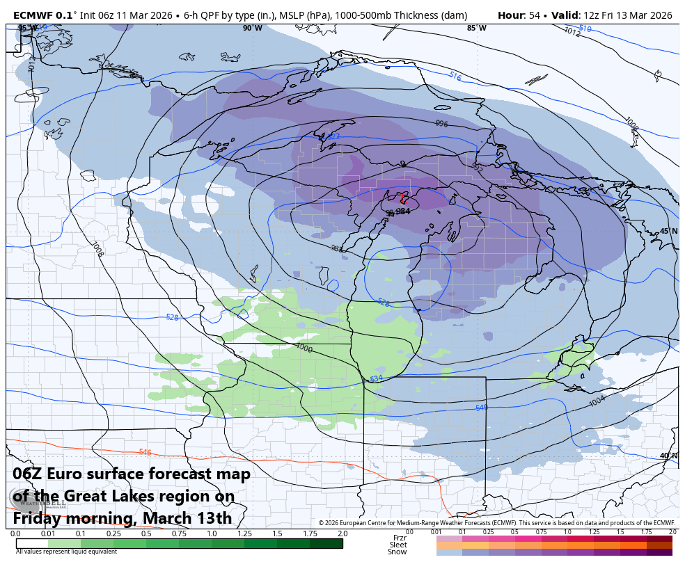 A clipper-like system will push across the Great Lakes region on Friday likely with strong winds and accumulating snow. Map courtesy ECMWF, Weather Bell