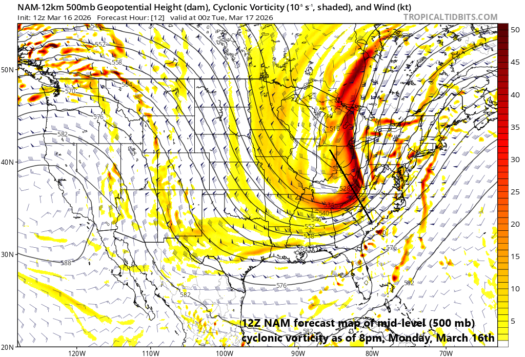 An upper-level trough will become “negatively-tilted” as the day progresses leading to enhanced upward motion in the Mid-Atlantic region…one of many ingredients coming together for this severe weather outbreak. Map courtesy NOAA, tropicaltidbits.com