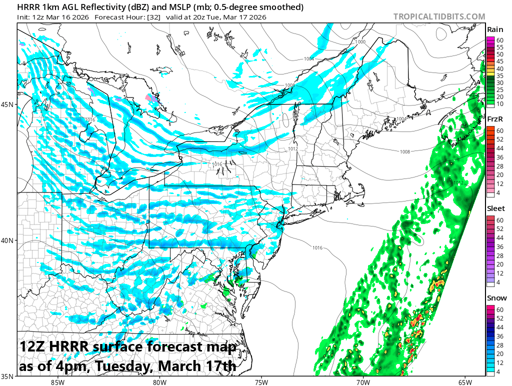 An organized squall line may form later today just ahead of the incoming strong surface cold front with powerful and damaging “straight-line” winds a possibility in the I-95 corridor and there can be isolated tornadoes as well. Map courtesy NOAA, tropicaltidbits.com