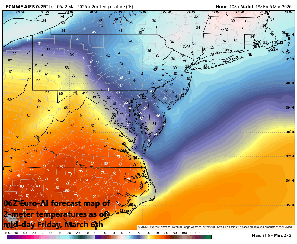 This time of year is famous for backdoor cold fronts in the northeastern part of the country which can quickly flip a spring-like day to winter’s chill. This kind of a flip is possible on Friday in the Mid-Atlantic region; especially, in the region from Philly and NYC to the north and east where colder low-level air could move in from the northeast. Map courtesy ECMWF, Weather Bell