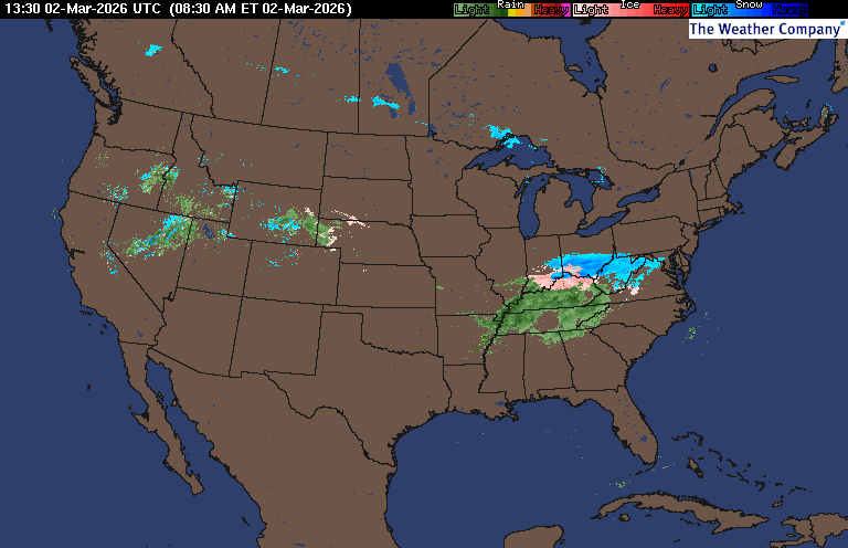 Latest radar images feature snow (in blue) just to the west of the DC metro region and this moisture field is moving from west-to-east. Radar courtesy WSI, Weather Underground, NOAA