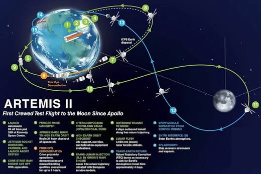 If all goes as planned, Artemis II will propel astronauts to the Moon for the first time since the Apollo era. This diagram shows 15 key stages of the flight (courtesy spaceweather.com, NASA).