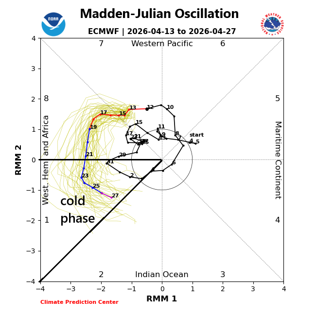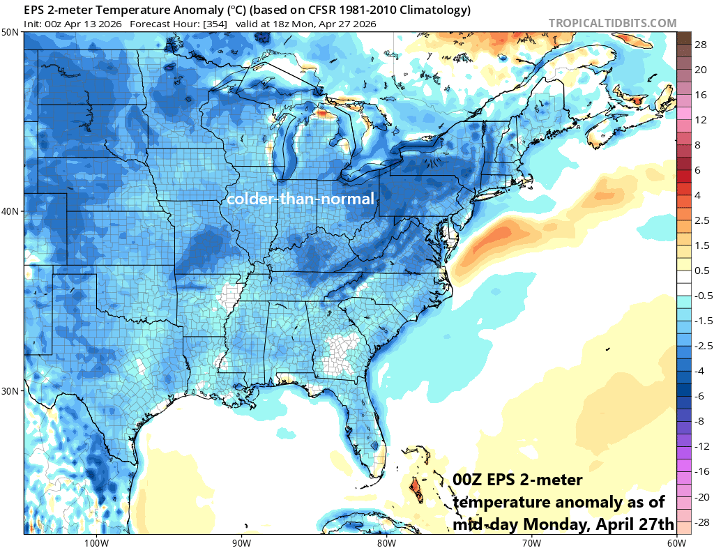 There are signs that the pattern flips to colder-than-normal for the central and eastern states by the last week of April. A teleconnection index known as the Madden Julian Oscillation or MJO will push into what is normally a colder-than-normal phase this time of year in the eastern half of the nation. Map courtesy ECMWF, tropicaltidbits.com