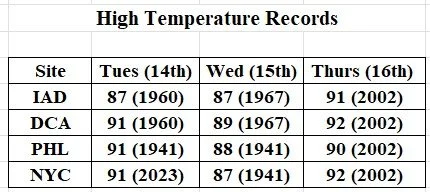 Air conditioners will get their first test of the year so far this week with a significant warmup coming to the Mid-Atlantic that will bring summer-like temperatures to the region. The peak of the warmup may come during the next three days with daily high temperature records in jeopardy on Tuesday, Wednesday, and Thursday in the DC-to-Philly-to-NYC corridor as the mercury can soar into the low-to-mid 90’s in some spots. In addition, it is not out of the question that some spots in the Mid-Atlantic region threaten to reach all-time high temperatures for the month of April; however, the heat wave of April 1976 (Bicentennial Year) will make that a hard threshold to top. (For example, New York City reached 96 degrees during the April 1976 heat wave; Baltimore, MD and Allentown, PA reached 93 degrees).