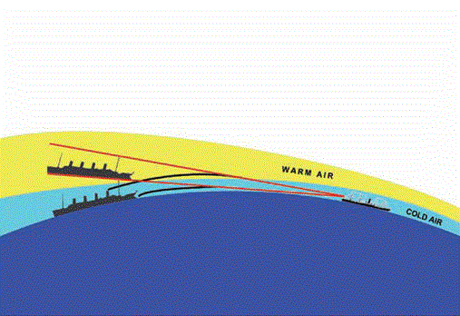 This diagram portrays a hypothetical view of the SS Titanic from the deck of the Californian through a pronounced superior mirage due to a strong temperature inversion. Due to the superior mirage and refraction of light rays (black lines), observers on the Californian will see (red lines) the Titanic as on the horizon. [courtesy Weatherwise magazine]