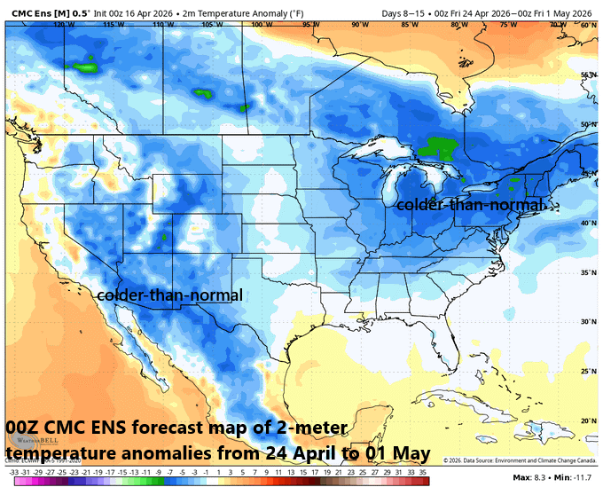 The overall weather pattern is likely to flip from today’s significant warmth across the central and eastern states to generally colder-than-normal conditions for the last week of April. Map courtesy Weather Bell Analytics, Canadian Met Centre