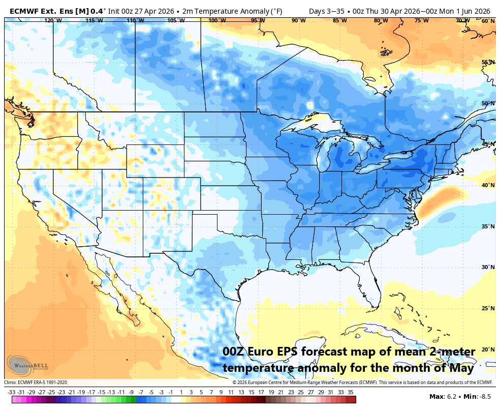 Colder-than-normal conditions appear likely in much of the eastern half of the nation during the month of May. Map courtesy ECMWF, Weather Bell Analytics