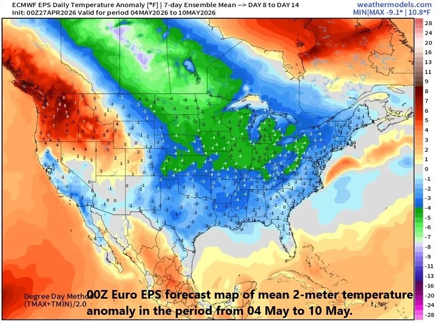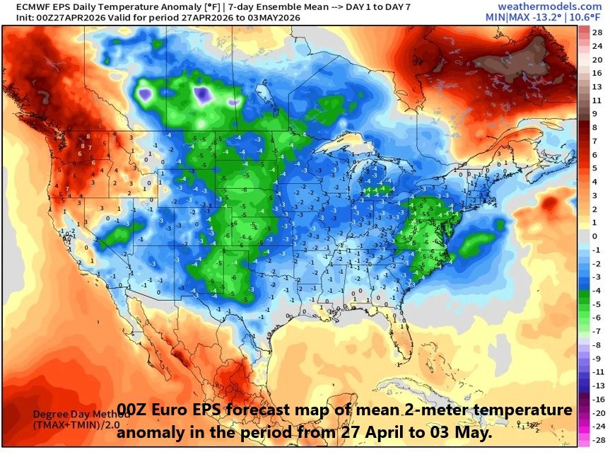 Colder-than-normal conditions appear likely in much of the eastern half of the nation during the period of April 27th to May 3rd. Map courtesy ECMWF, weathermodels.com