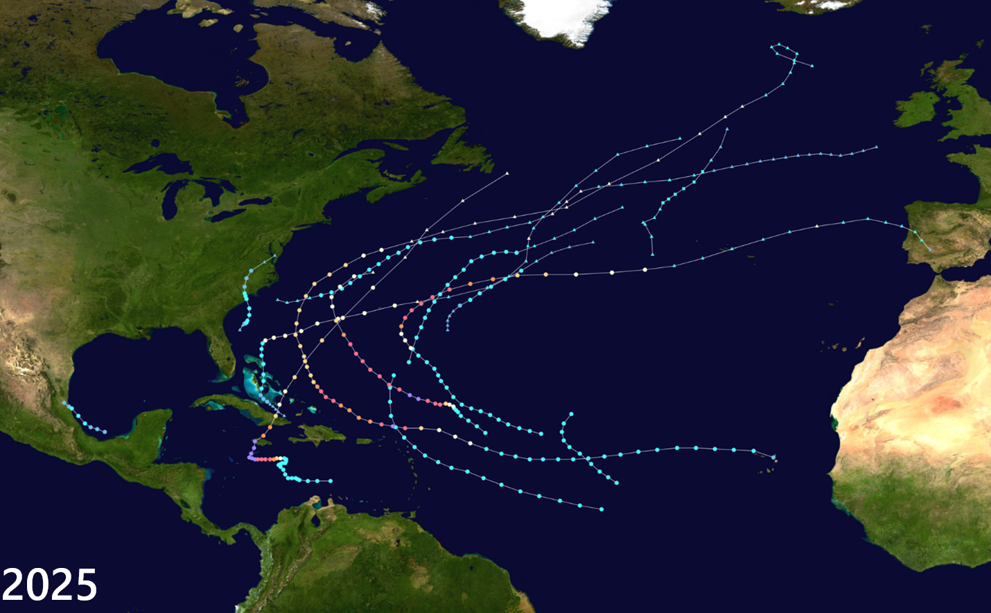 2025 Atlantic Basin tropical storm tracks are shown on this plot, and it was slightly below-average year in terms of number of named storms (13) but had a higher-than-average Accumulated Cyclone Energy (ACE) for the Atlantic Basin which is a metric that factors in both storm magnitude and longevity. (Plot courtesy Wikipedia)