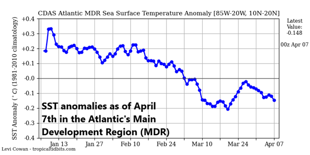 Water temperatures in the Atlantic Ocean’s Main Development Region (MDR) trended downward during the winter season and remain slightly below normal as we progress through early spring. We’ll monitor this to see if water temperatures remain in colder-than-normal territory as we get closer to the summer (tropical) season as it would an unfavorable pattern for tropical storm and intensification in the Atlantic Basin. Map courtesy NOAA, tropicaltidbits.com