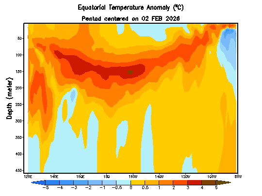 Sub-surface water temperature anomalies (°C) down to a depth of 450 meters are shown here from the equatorial part of the Pacific Ocean in the period from 02 February 2026 to 03 April 2026. Much warmer-than-normal water (shown in orange/brown) is now lurking just beneath the surface (top) across much of the tropical Pacific and the cold water (shown in blue) at and just below the surface level has tended to shrink in extent in recent days. Map courtesy NOAA/CPC, International Research Institute [Note – “Nino 3.4” region is 120°W-170°W.]