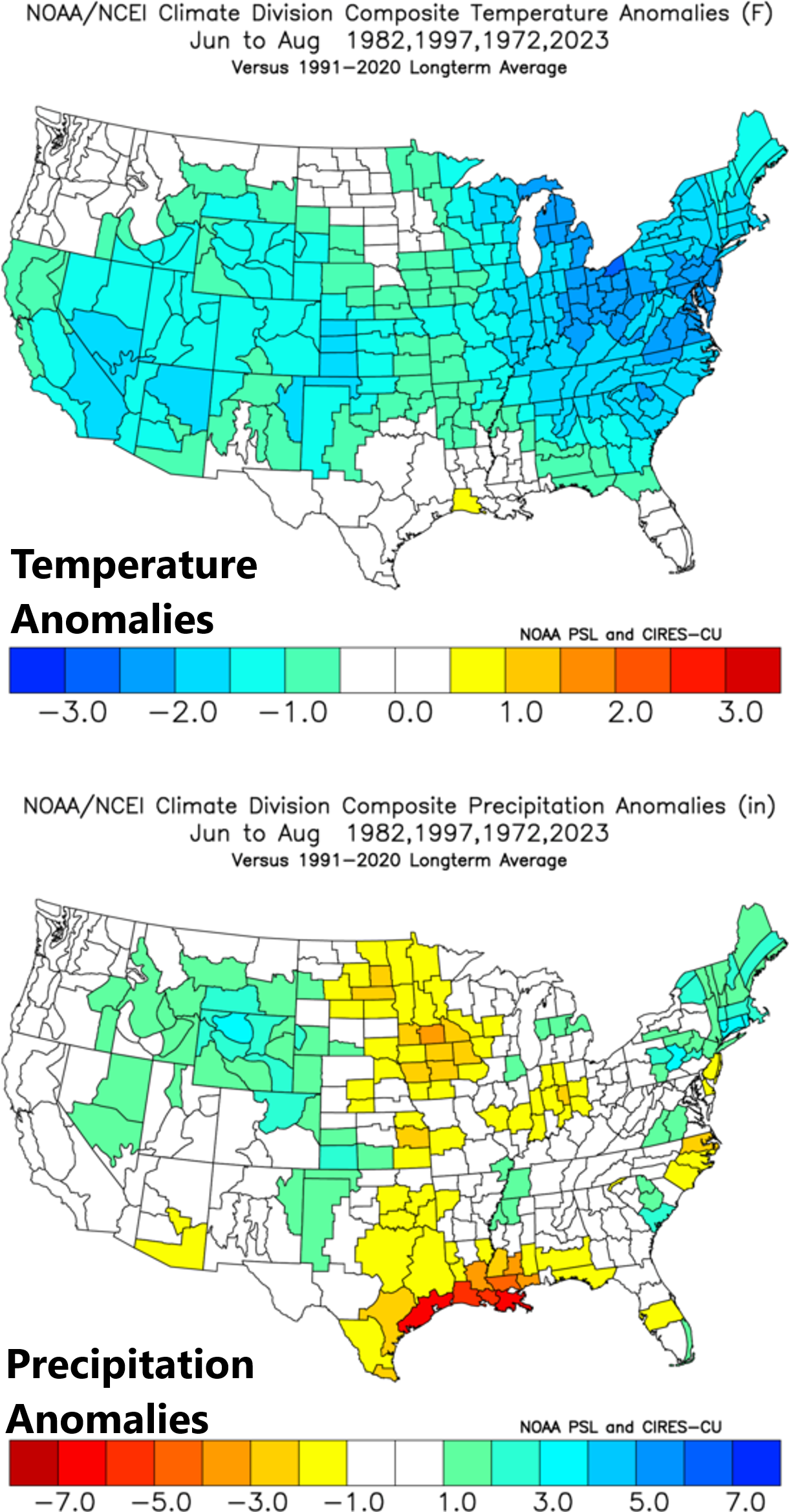 As such, I have determined that the following four years match rather closely to what is expected this summer and fall: 1982, 1997, 1972, 2023. When averaged together, these selected “analog” years featured below-normal tropical activity with ~10 named tropical storms, ~4 hurricanes, and ~1 “major”. Also, when averaged together, these 4 analog years featured cooler-than-normal conditions across a large part of the nation with a focus on the Mid-Atlantic region. In terms of precipitation amounts, the picture is somewhat mixed with generally wetter-than-normal conditions across the northeastern states and drier-than-normal weather in much of the central US.